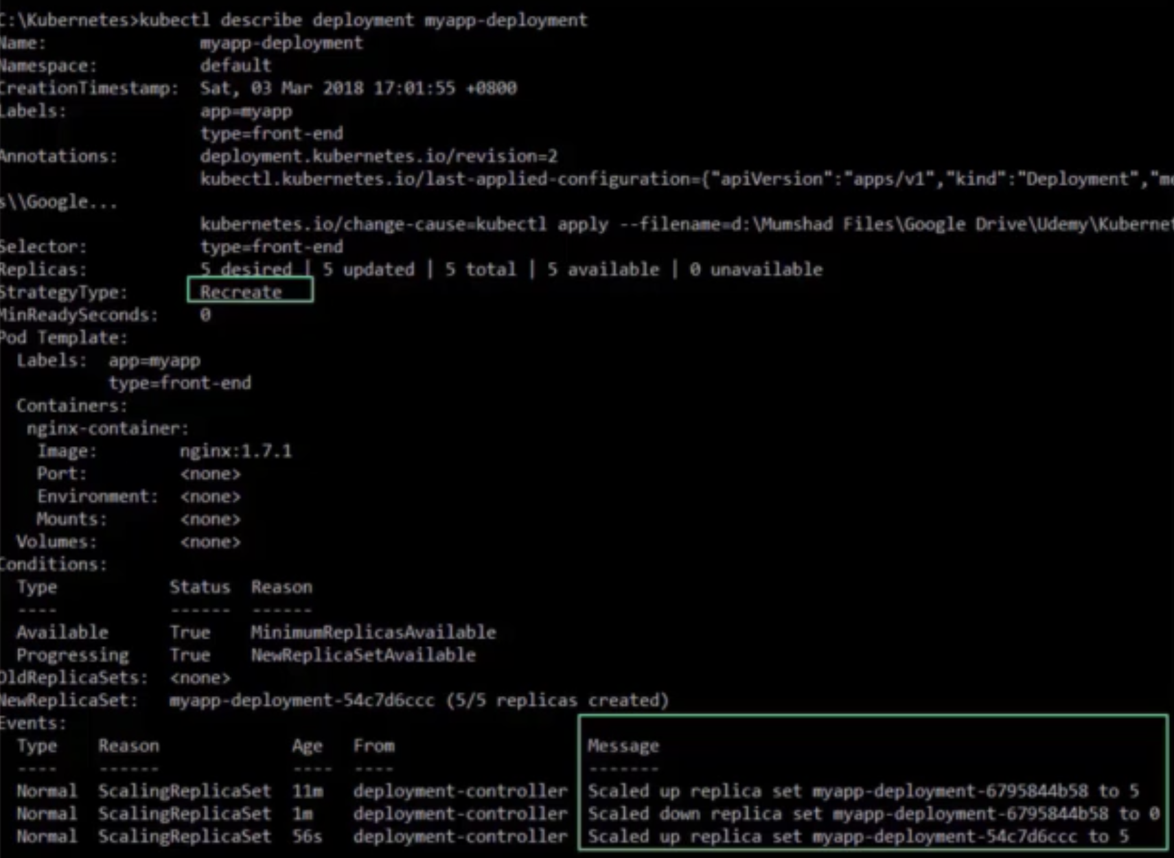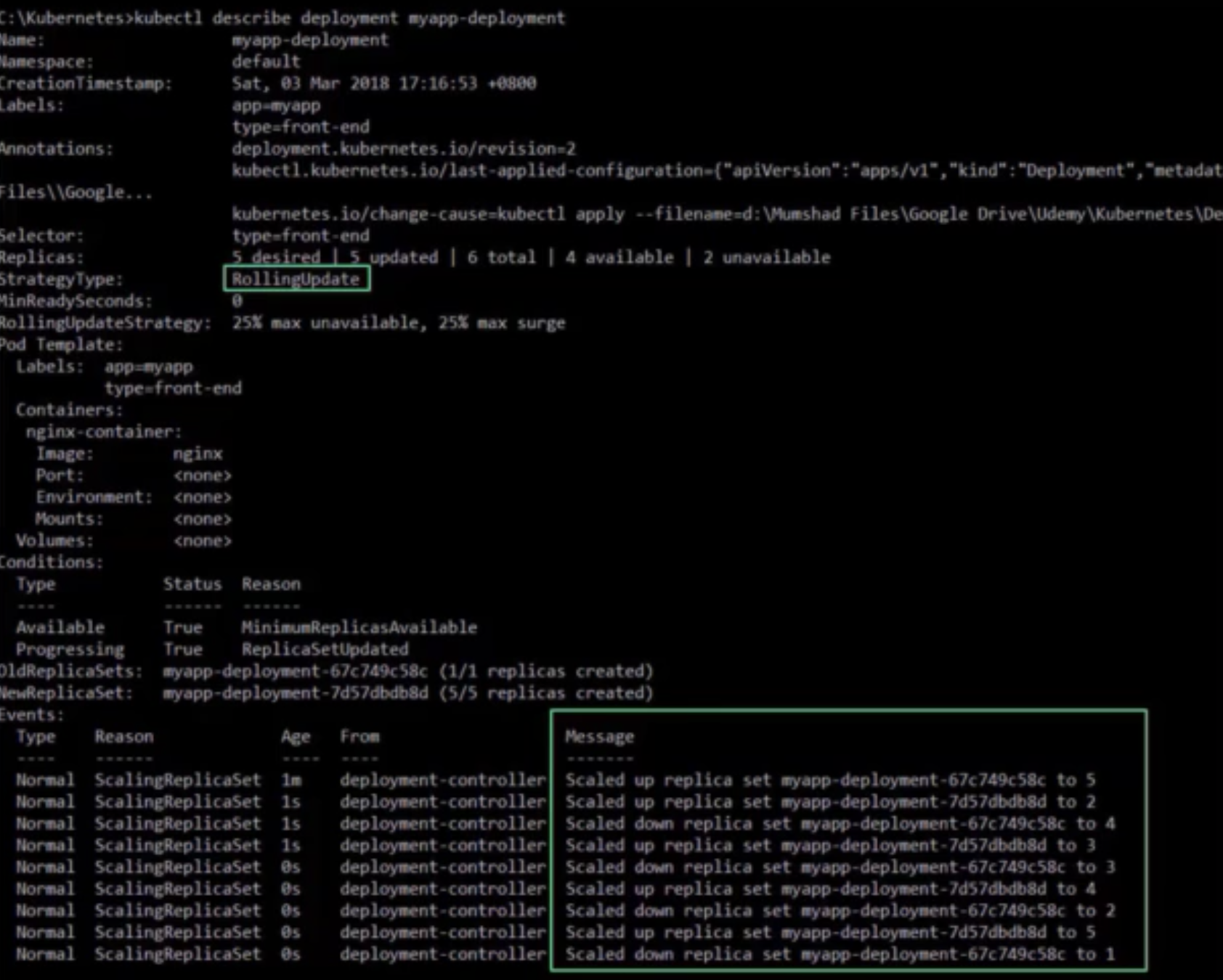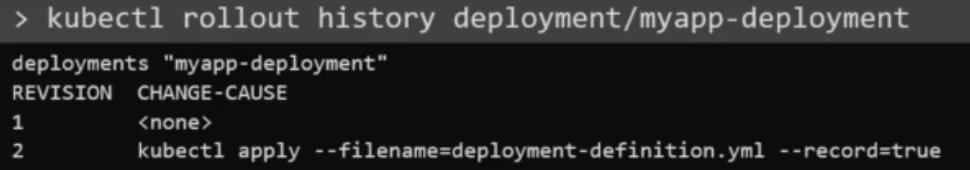 특정 버전 정보를 보려면 --revison 사용(kubectl rollout history deployment/myapp-deployment --revision=2)