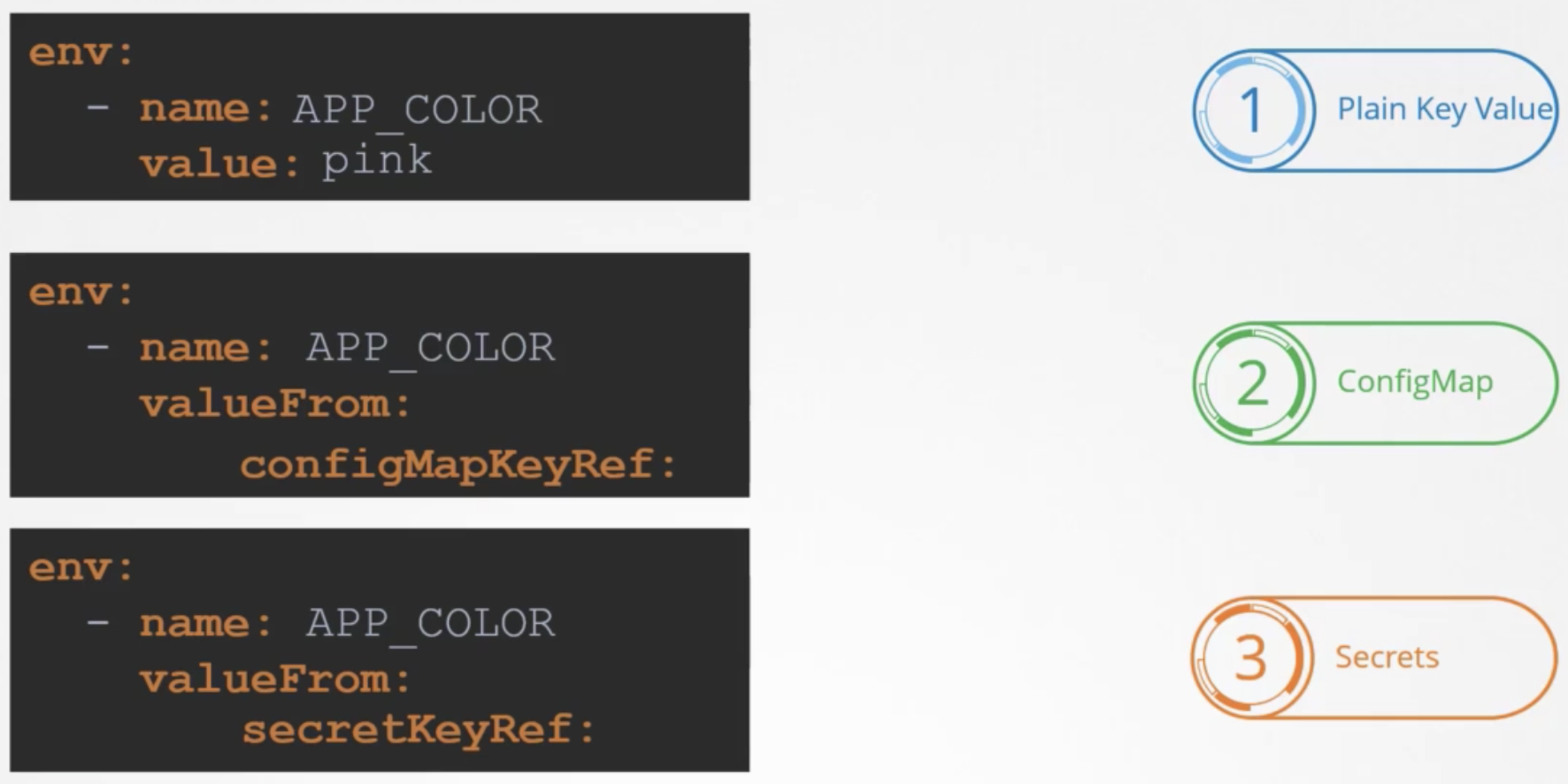 TL;DR 크게 3가지 방법(plain, configMap, Secretes)으로 설정이 가능하다.