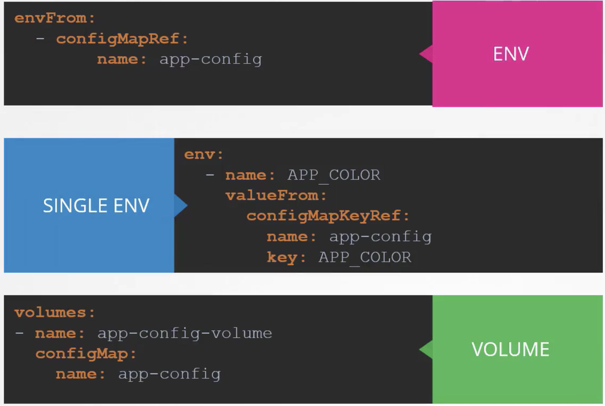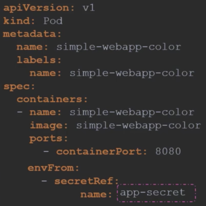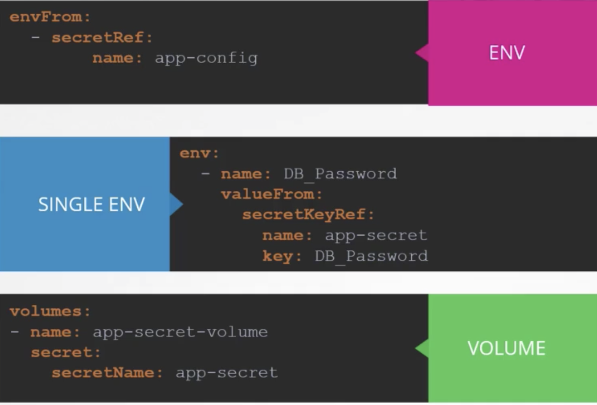 크게 세 가지 방법으로 주입 가능(file 형태, configmap 중 개별로 주입, volume으로 사용)