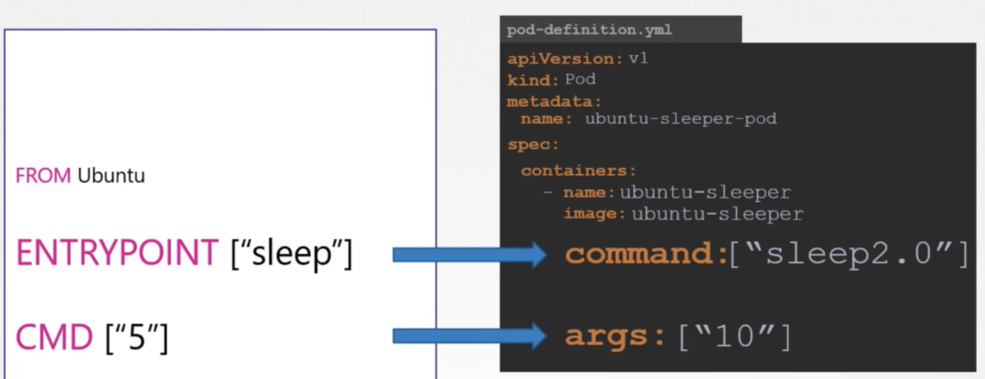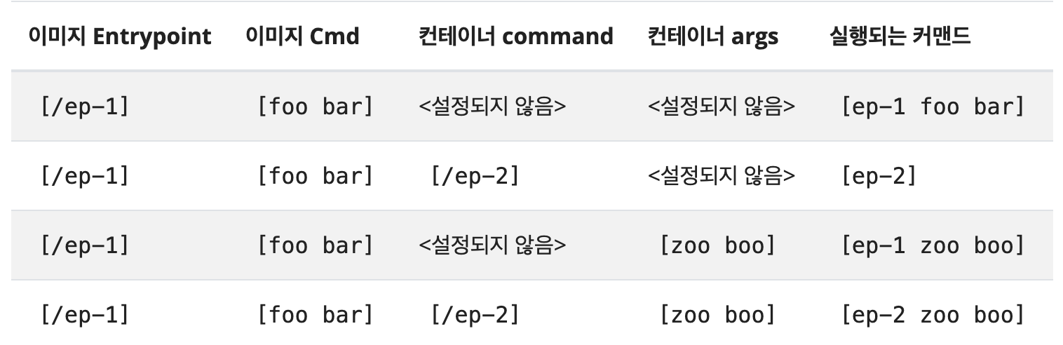 docker에서 쓰이는 entrypoint와 cmd를 k8s에서는 command와 args라는 이름으로 바꿔서 쓰이고 있다.