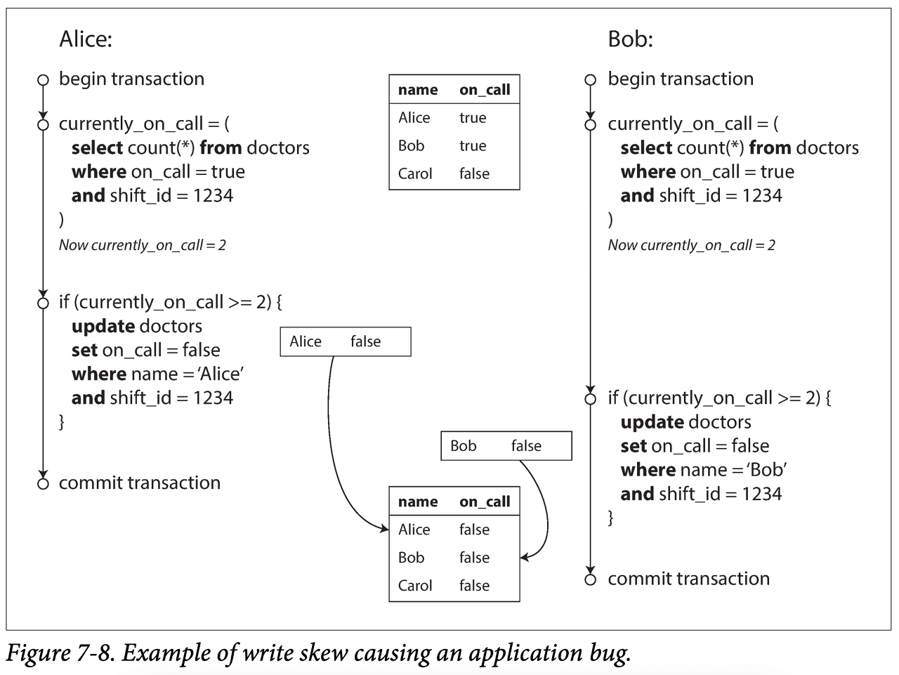- 같은 객체를 업데이트하면 Lost Update 문제, 다른 객체를 업데이트하면 Write Skew 문제라 할 수 있다.