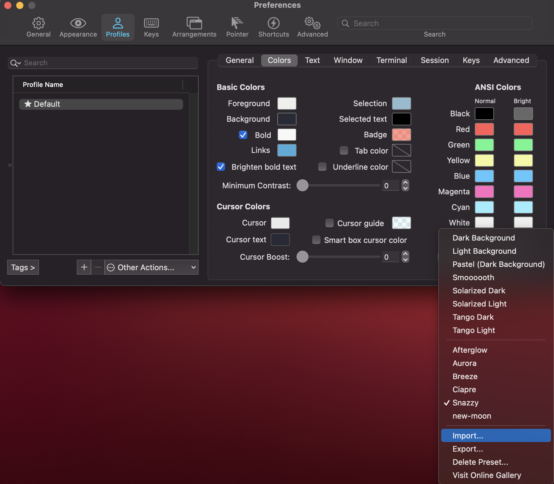 다운로드한 Snazzy.itermcolors를 import 하여 사용합니다.